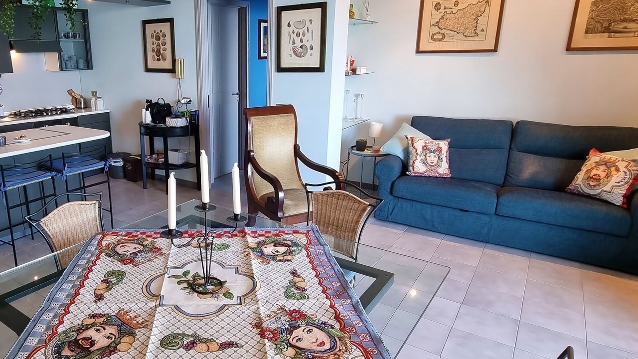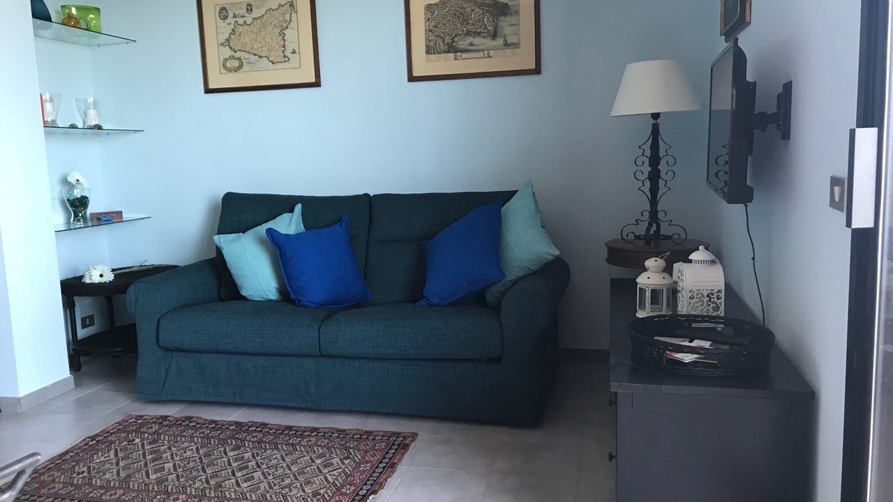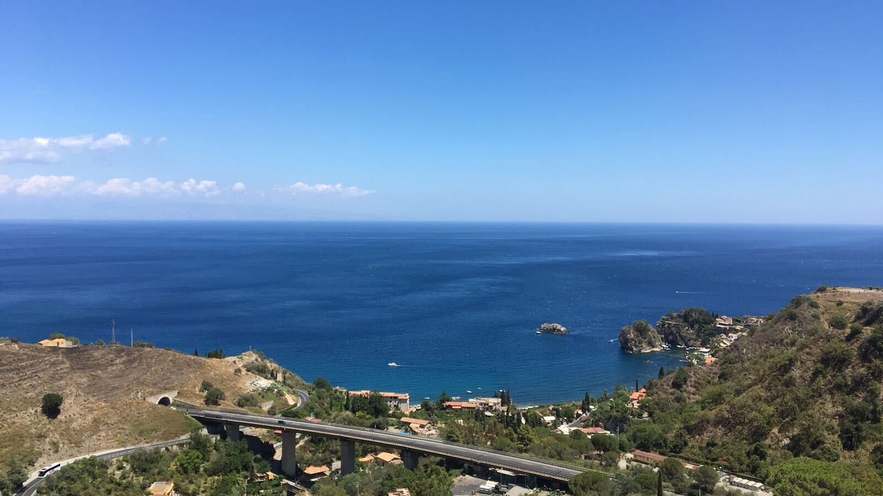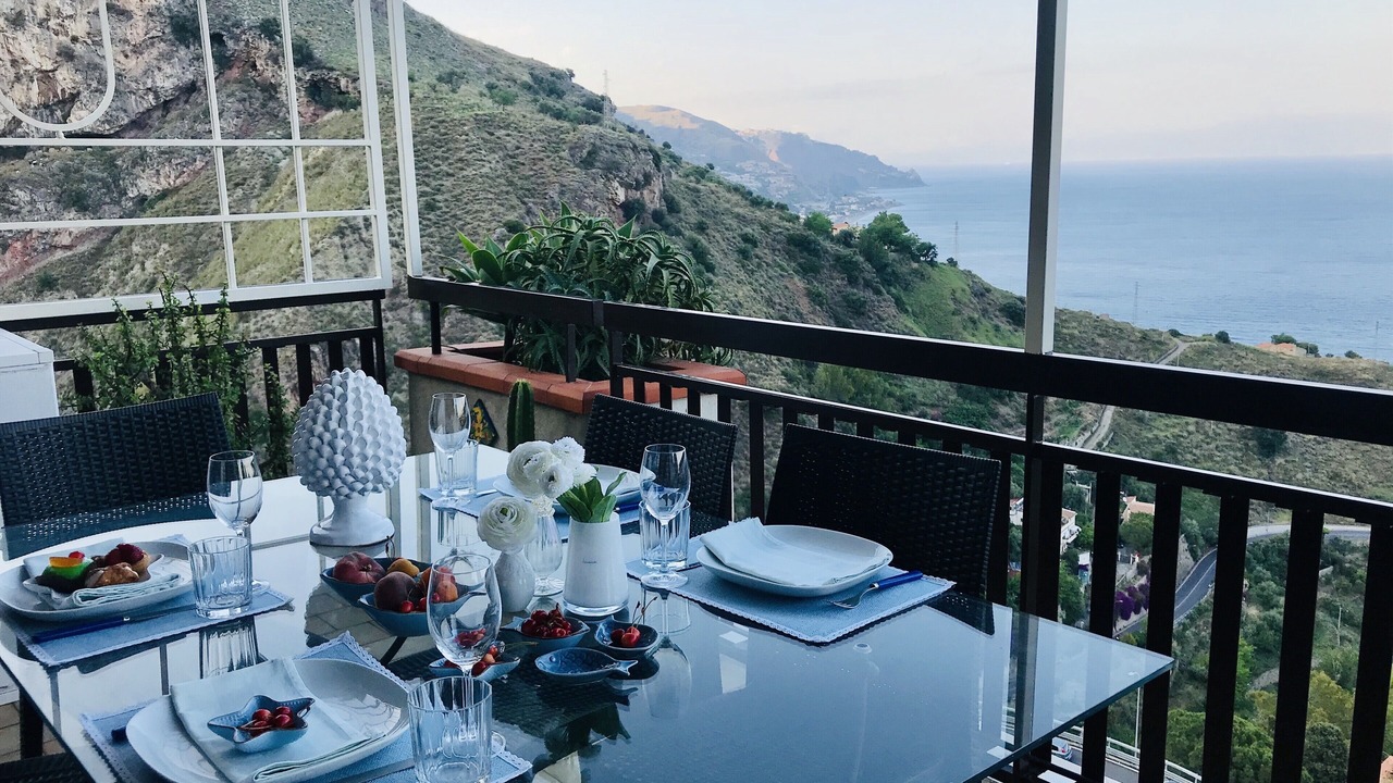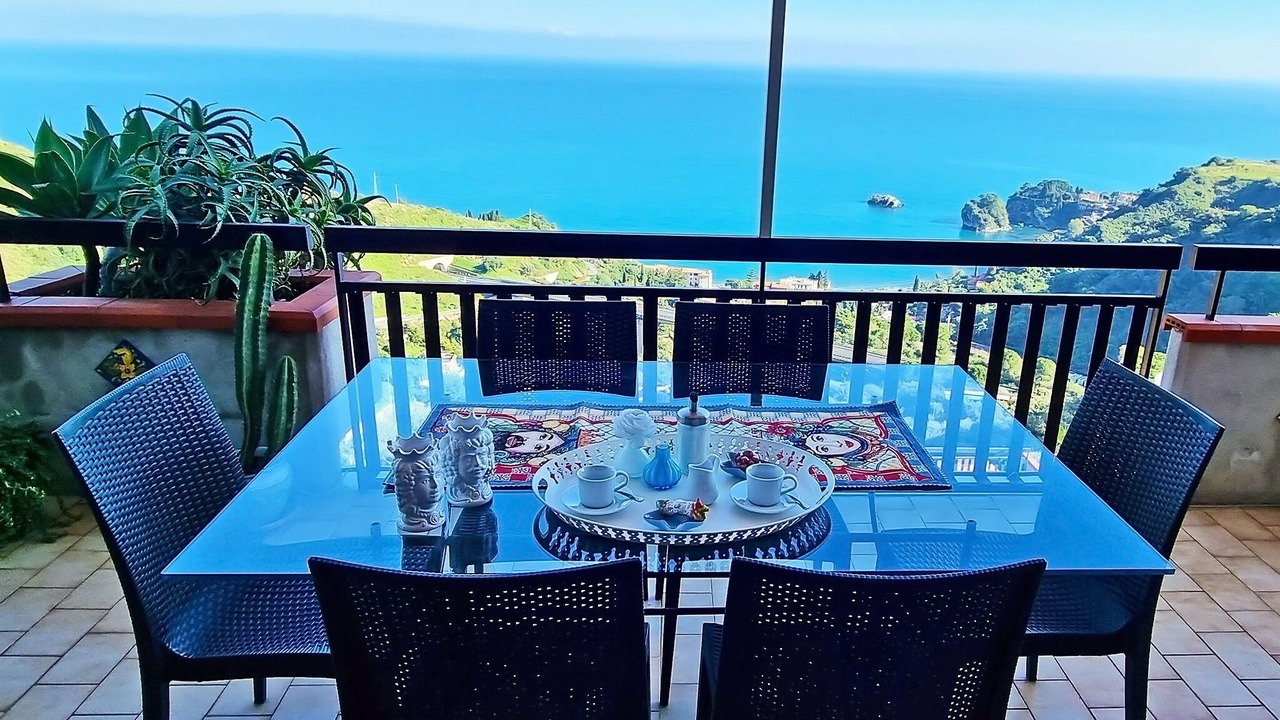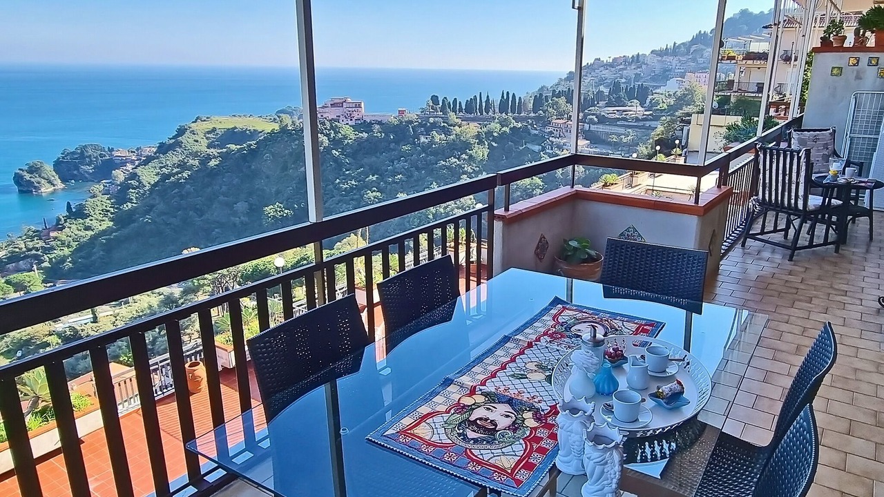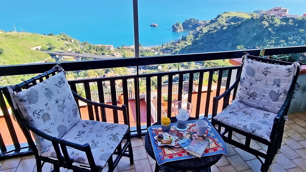 Bright two-bedroom apartment with stunning views of the bay of Mazzaró, Capo S. Alessio, the Ionian coast with the picturesque medieval village Forza D'Agrò, the Calabrian coast, the Peloritani Mountains and the blue of the Ionian Sea.