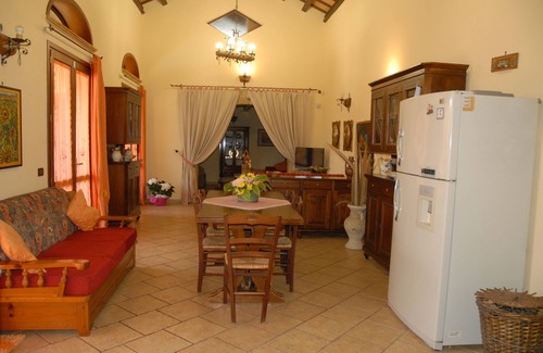 The apartment has 8 beds, plus a cot for children and the possibility of adding a single bed. It has two double bedrooms and two double sofa beds in the open space. It has two bathrooms, one inside with hydromassage shower and waterfall for the neck and one outside just two meters away. It offers a whole series of luxury comforts: 4 full HD LED TVs, air-conditioned rooms. Traditional gas kitchen, double oven, one of which is wood-burning for lovers of the genre, large living room for dream relaxation. Each environment is carefully cared for to spend a holiday in freedom that you will remember forever. The rooms are completely autonomous. The inside apartment is about 150sqm. At guests' disposal, exclusively, the use of the external barbecue, of the external stoves while the swimming pool, unique of its kind and the adjacent spaces, are shared with the other guests of the villa. There is also the possibility of using many paid services: shuttle to the airports, bicycle rental. The structure has an agreement with beaches, restaurants, kitesurf instructors and diving centers. The swimming pool can also be used at night in order to respect the rest of the other guests present in the villa.