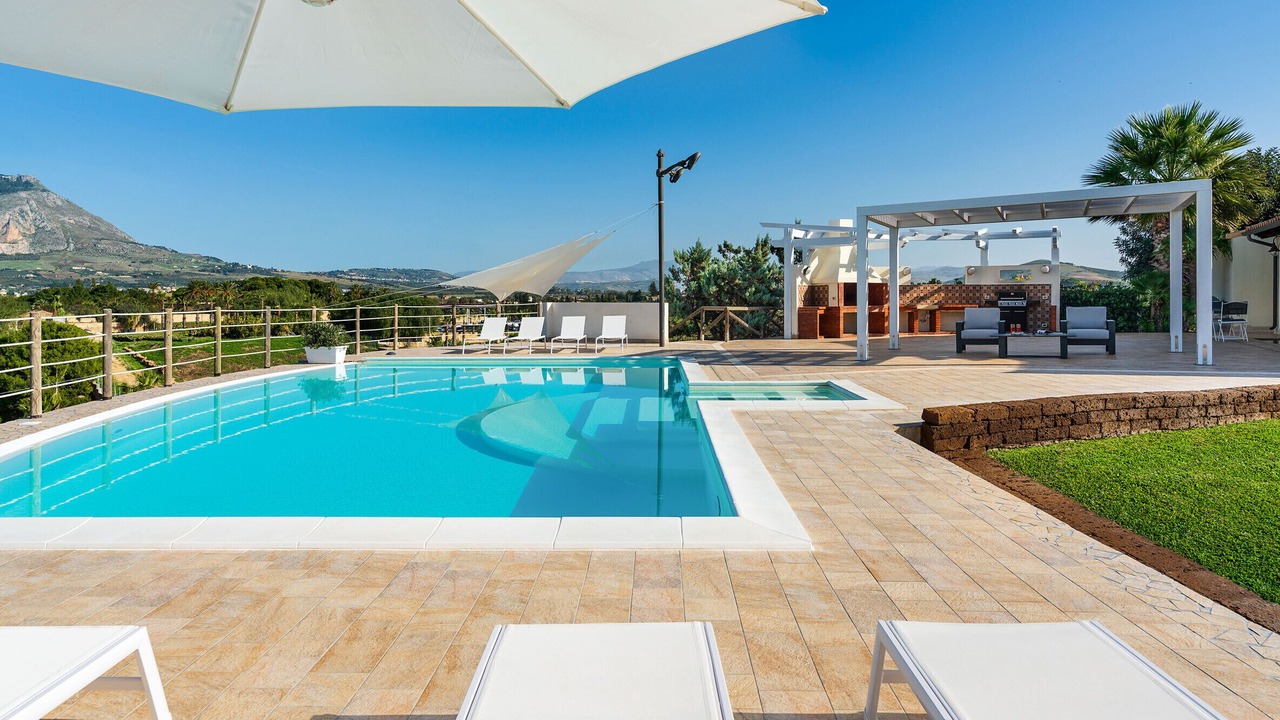 Villa Cielo is a beautiful, comfortable villa with private swimming pool situated in a splendid panoramic location near Trapani, ancient town at the extreme western point of Sicily. Surrounded by a well-tended garden, large equipped terraces with an amazing overflow pool, Villa Cielo enjoys enchanting views across Mount Erice, Trapani and Paceco’s saltapans to the Egadis. The property is on three levels and includes a bright living room with fireplace, a well-equipped kitchen, a large basement room with kitchen, fireplace, bar and billiard table, five cosy bedrooms and four bathrooms, one of which is outside. Furnished with taste, these inviting rooms come with internet Wi-Fi, air conditioning, heating (radiators), satellite TV, dishwasher, washing machine and dryer.Villa Cielo is the ideal location for families or groups of friends in search of a relaxing holiday but with the chance to explore the charms of western Sicily. The ancient salt pans and the Stagnone lagoon, Trapani, Erice, Segesta, San Vito Lo Capo, the Zingaro nature reserve and the Egadi islands (connections from Trapani and Marsala) are all within easy reach.Interior:Ground Floor: large living/dining room with fireplace, kitchen, 1 double bedroom, 1 bedroom with a large single bed, 1 bathroom with tub. First Floor: 1 double bedroom, 1 twin bedroom, 1 bathroom with shower. Lower Floor: basement room with kitchen, bar, fireplace and billiard table, 1 double bedroom, 1 bathroom with shower.Exterior: 1 bathroom with shower, terrace, covered terrace with dining area, bbq, garden, swimming pool, sun terrace.Check-in: 16:00 - 21:00Services included: final cleaning, bed linen and towels, water and gas consumptions.Extra services (to pay on the spot): safety deposit euro 500 in cash, air conditioning, heating.