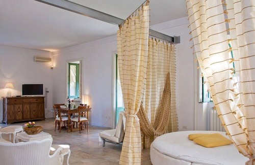 The first floor is used as a holiday home (the caretaker lives on the ground floor). The garden and swimming pool are for the exclusive use of our guests. The flat consists of a large, bright living room which has an elegant round bed in one corner that can accommodate two children or one adult. From this room you can access the well-equipped kitchen. A corridor leads to the sleeping area where there are two large, bright and comfortable double bedrooms (one with bath and one with shower) and two bathrooms. Finally, there are two beautiful balconies overlooking the garden and the archaeological area.