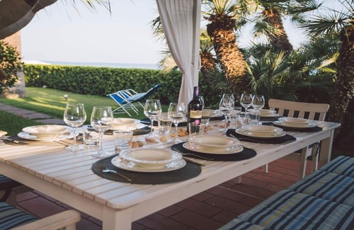 Directly facing the Blue Flag beach of Santa Maria del Focallo (Pozzallo) with its stupendous crystal clear water, Villa Aquamarina is a jewel with a splendid view from where you can admire beautiful sunsets over the sea. The marine setting combined with modern décor and the garden with direct access to the beach make this a unique home, able to provide a comfortable holiday, relaxing in the sun and on the beach. In the large furnished gazebo overlooking the sea you can organize exciting alfresco meals with typical Sicilian dishes while, for those not wanting to cook, close by is a beach bar/restaurant, Il Capitano, one of the most famous in the area where you can dine directly on the beach. The villa, thanks to its location and extras, is excellent for both family holidays or romantic stays and allows you to make quick excursions to tourist spots like Modica, Ragusa and Donnalucata or to book a catamaran to spend half a day in Malta.