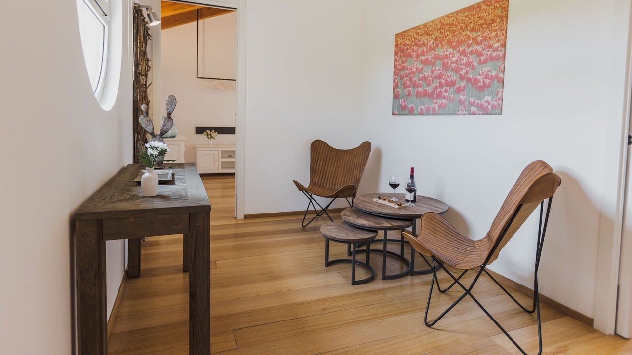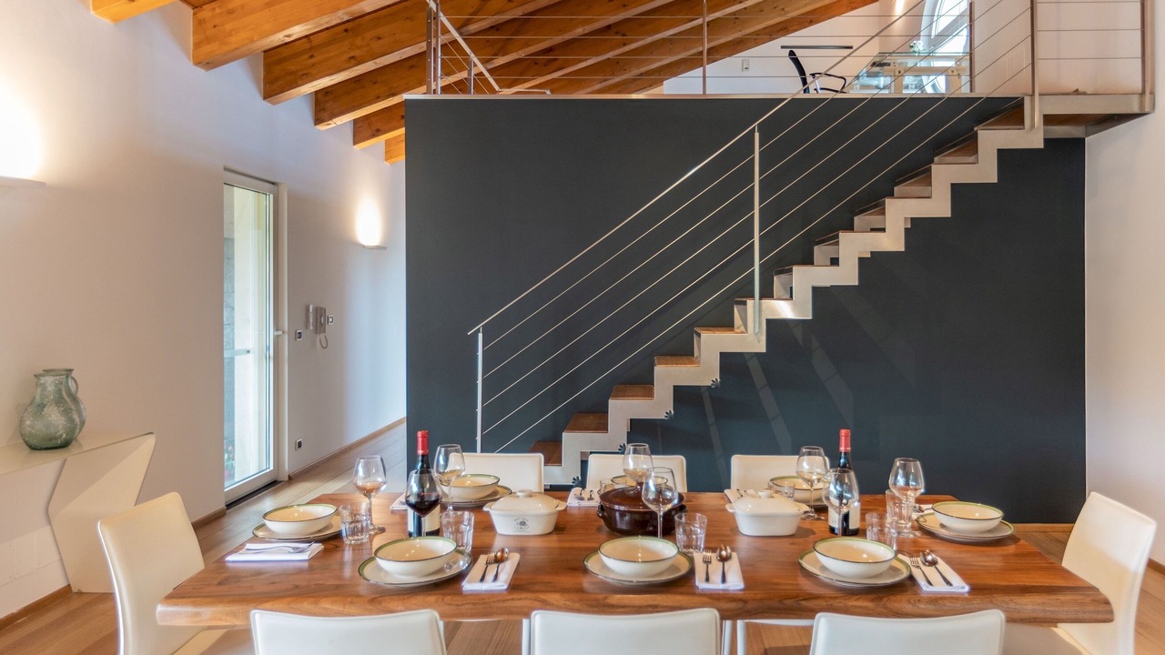 Il casale è disposto su due piani collegati sia da una scala interna che dall’esterno. Dal disimpegno al piano terra si accede da un lato alla zona notte, che comprende una camera matrimoniale ed una camera doppia (con letti unibili) che condividono un bagno con doccia e una matrimoniale con bagno en-suite con vasca e doccia. Dall’altro lato si accede alla cucina ben attrezzata e a seguire l’open space con salone e zona pranzo, ben illuminata grazie alle porte finestre affacciate sul giardino. Dal salone si accede al bagno di servizio e alla zona studio su un soppalco. Una scala interna porta al piano seminterrato con un secondo ambiente che accoglie un’ulteriore cucina con forno in pietra per la pizza che potrà essere utilizzato su richiesta con l'assistenza di personale, zona pranzo e zona living con grandi porte finestre che portano al pergolato all’esterno. Su questo piano si trova la quarta camera matrimoniale, anch’essa con grande vetrata sull’esterno e bagno en-suite con doccia. Il locale della lavanderia completa la composizione di questo piano.