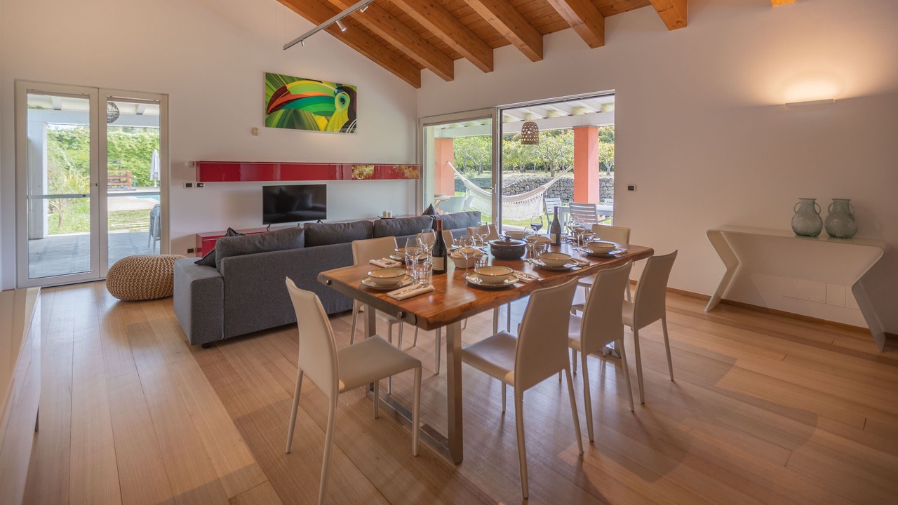 The area is known for its juicy and fragrant citrus fruits. The house is located within the farm managed by the owners who mostly grow pink grapefruit. The plantation extends over 9500 metres. Around the house is a well-kept, gently sloping lawn that connects the ground floor with the basement. These two floors have paved spaces with pergolas offering shaded areas for dining and relaxing. On the ground floor is a large dining table and a relaxation area with comfortable sofas and armchairs. On the basement floor is a second dining table under a pergola with mobile barbecue.Please notice that photos are taken in spring, therefore flower blossoming, and the colours of the gardens' grass could be different at the moment of your arrival at the villa.