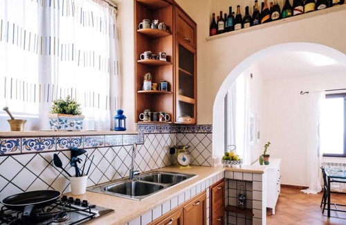 The villa has two terraces overlooking one of the most beautiful gulfs in Sicily. A covered terrace with a nicely furnished relaxation area and rich ornamental plants, facing the Gulf of Capo Zafferano and behind the green of the Monte Catalfano nature reserve. In the second terrace you can enjoy complete privacy and quiet, surrounded by greenery, equipped with all comforts to spend your holiday in complete relaxation (barbecue area, table with umbrella, deckchair, outdoor shower), the terrace overlooks saffron head and on the small basin of the "three pools", all around a suggestive vegetation and succulents. The colors of dawn and sunsets spent in these places will be unforgettable, Capo Zafferano is tinged with pink and the seagulls return. The breathtaking view can also be enjoyed inside, from the bright living room and the kitchen, just look around for the feeling of being suspended in the blue. The house offers a large living room with fireplace, dining area and sitting area with a large window overlooking the sea, connected to both terraces, built-in kitchen decorated with colorful majolica made by local craftsmen (complete with 4 burner stove, electric oven, oven microwave and fridge), two bedrooms, one double and one bedroom with three single beds (with possibility to make it double) and a large bathroom with washing machine and tempered glass shower. The house is tastefully furnished with a fresh style and attention to detail. All rooms (including living room) equipped with air conditioning and heating system to ensure maximum comfort even for those who choose to visit us in autumn and winter.
