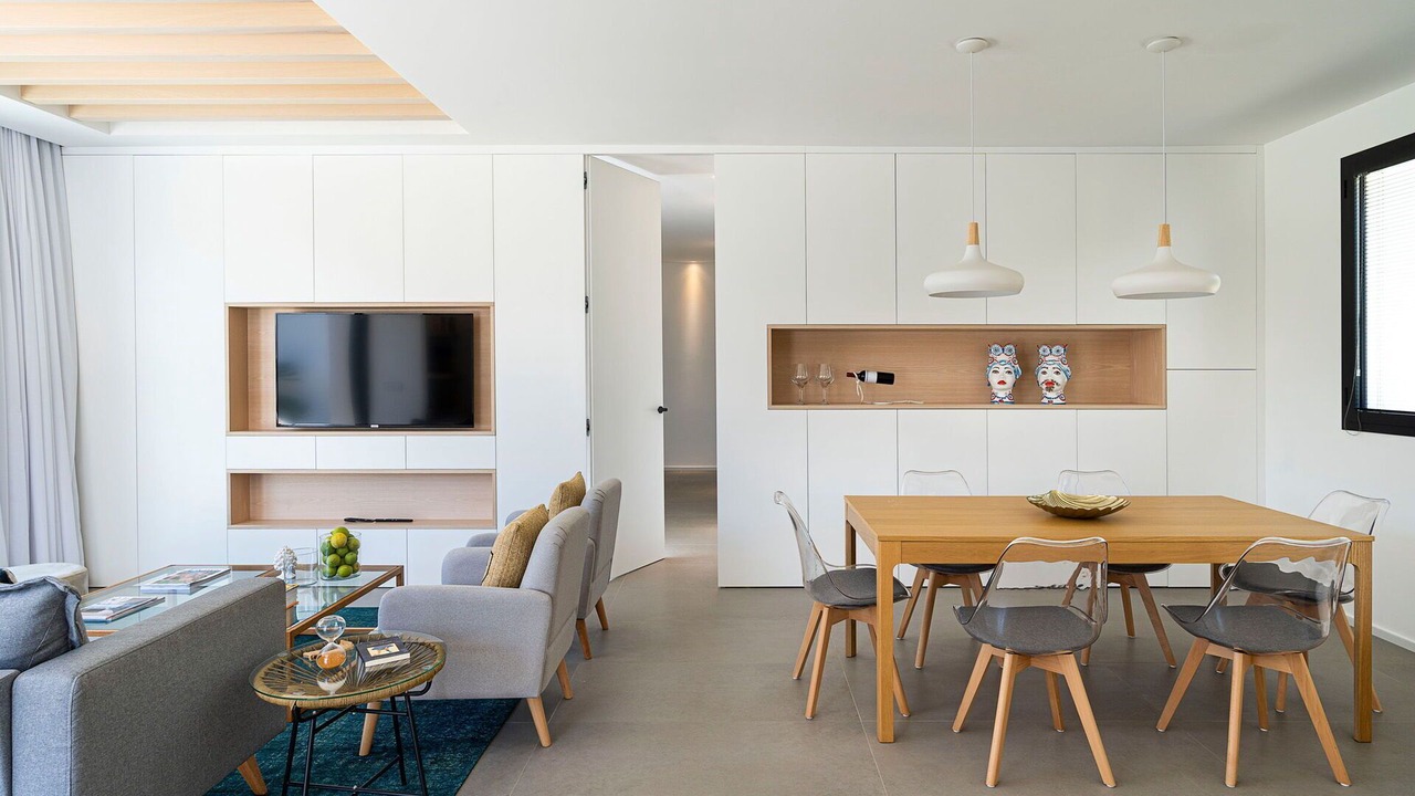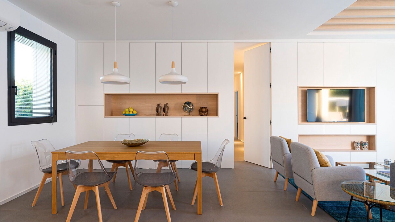 Living room: sofa (people: 2), three armchairs, working desk, dining table (people: 6), WIFI internet, internet, air conditioning, satellite tv, exit to the terrace.