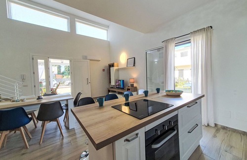 Your 4-room semi-detached house spans 140 square meters across two levels, providing ample space for a comfortable vacation. The property boasts a spacious and bright interior with tasteful furnishings, creating a welcoming atmosphere. On the entrance level, you'll find a large, open kitchen and living room, complete with a dishwasher, four induction hot plates, a kettle, microwave, electric coffee machine, and a cooking island. This area also features a TV, air conditioning, and forced-air heating, ensuring your comfort throughout your stay. The kitchen opens to the garden and a terrace, offering seamless indoor-outdoor living. Additionally, this level includes a shower room with a bidet and toilet.