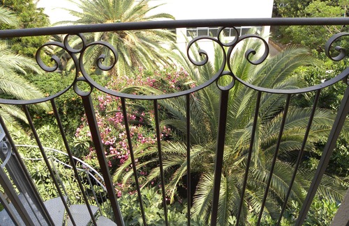 The TERRACE SUITE (advert 8398) is located above the Garden Suite and has independent exterior access with stairs overlooking the subtropical garden. This section is perfectly sized for your romantic holiday. The fully furnished large decks (60 square meters) are covered with traditional logs and clay tiles, perfect for indulgent candlelight dinners while you relax at the breeze of the sea and enjoy the view of the mountains and the nearby town, after a day of sightseeing. You would then catch your dreams in the most comfortable custom-made beds and 100% cotton linen. You will enjoy the vaulted ceilings, the original oil paintings on the walls and the birds and cherries hand-painted on the new custom-made cabinets of the kitchen area.